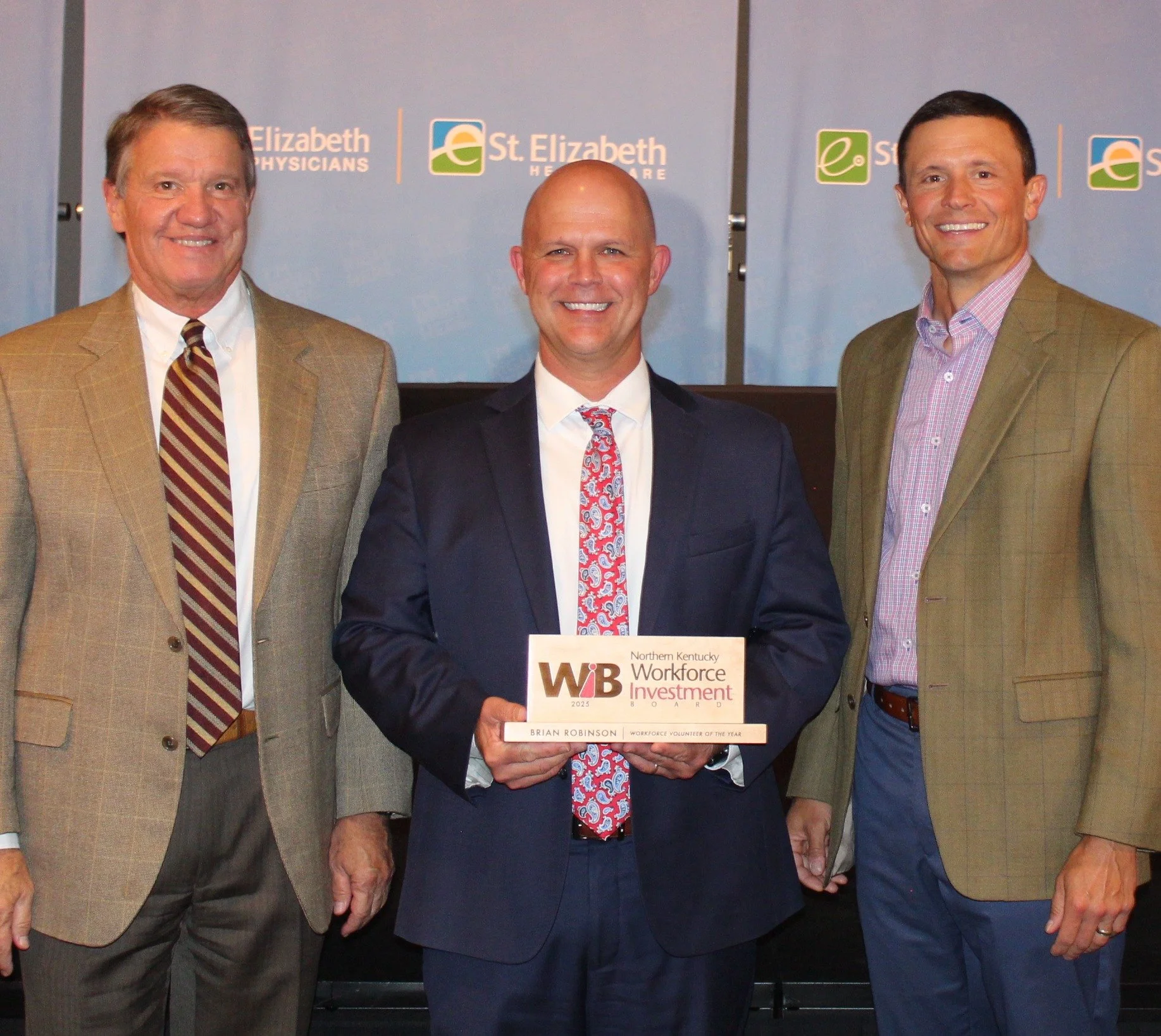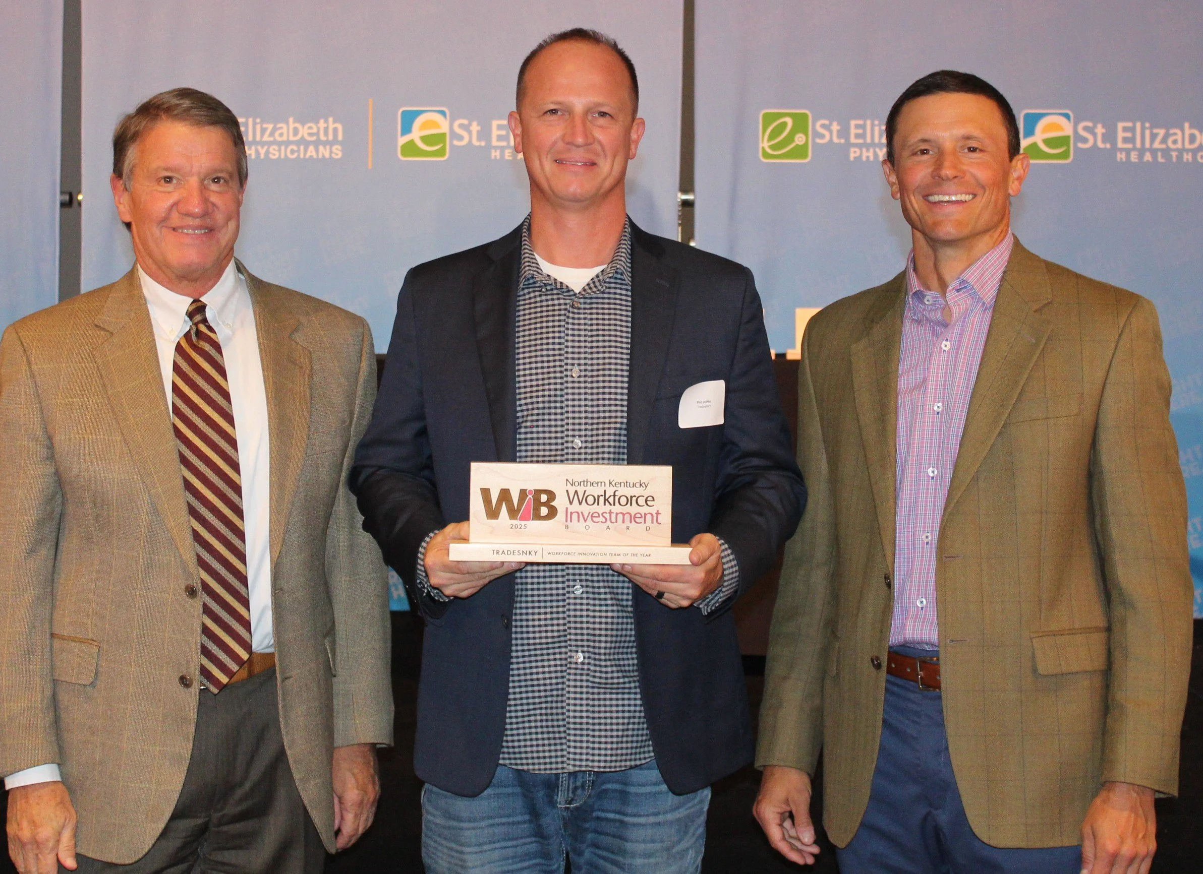 Phil Griffin of TradesNKY (center) accepts the 2025 Workforce Team of the Year from Campbell County Judge/Executive Steve Pendery (left) and Brian Bozeman (right). Pendery is Chair of the NKY Works Executive Committee. Bozeman is Chair of the Northern Kentucky Workforce Investment Board.